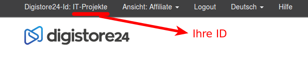 Der spezielle Werbelink, den Sie (oder Ihr Webmaster) hier erhalten, sorgt für die richtige Zuweisung Ihrer 50% Provision innerhalb Ihres Digistore24-Kontos (wir kommen gleich dazu), und zwar genau dann, wenn jemand auf diesen Link klickt und im Verlauf der nächsten 180 Tage kauft. Die Provisionszuordnung passiert bei Klick vollautomatisch. Digistore24, ein unabhängiger Zahlungsdienstleister, sammelt Ihre Provisionen und überweist dann in von Ihnen bestimmbaren zeitlichen Abständen das Guthaben auf Ihr persönliches Bankkonto, gleichfalls automatisiert. Einfacher geht’s ja nicht! Zunächst jedoch benötigen Sie eben bei unserem Zahlungsanbieter Ihr eigenes Digistore24-Konto, für das Sie sich kostenlos anmelden müssen. (Sollten Sie schon ein Digistore24-Konto haben, überspringen Sie diesen Schritt.) Ihr Anmeldename bei Digistore24 ist zugleich Ihre persönliche sog. Digistore24-ID. Diese ID benötigen Sie, um im Formular unten Ihren Affiliate-Link für unsere Produkte zu erzeugen. Nach einem Login bei Digistore24 ersehen Sie im Zweifelsfall oben links Ihre ID:
